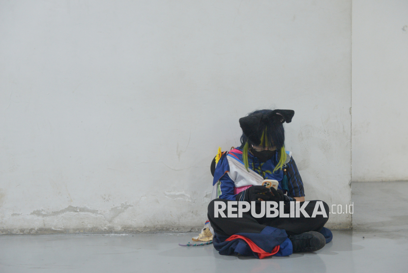 Pengunjung mengenakan kostum karakter anime beristirahat dalam ajang Cosplay Expo 2025 di Gelora Bung Karno (GBK), Senayan, Jakarta, Sabtu (18/10/2025). Cosplay Expo 2025 menjadi salah satu ajang budaya pop paling dinantikan tahun ini. Acara yang berlangsung selama dua hari tersebut menampilkan beragam pertunjukan, mulai dari penampilan cosplayer ternama hingga aksi panggung idol performance. Kegiatan ini tidak hanya menjadi hiburan, tetapi juga menjadi wadah apresiasi terhadap kreativitas dan semangat komunitas budaya pop yang terus berkembang. (FOTO : Republika/Prayogi)
