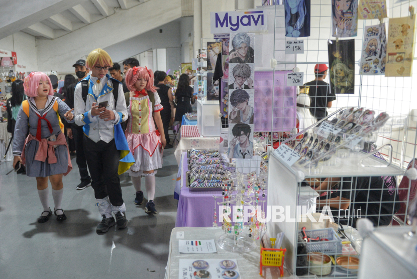 Pengunjung mengenakan kostum karakter anime mencari sovenir dalam ajang Cosplay Expo 2025 di Gelora Bung Karno (GBK), Senayan, Jakarta, Sabtu (18/10/2025). Cosplay Expo 2025 menjadi salah satu ajang budaya pop paling dinantikan tahun ini. Acara yang berlangsung selama dua hari tersebut menampilkan beragam pertunjukan, mulai dari penampilan cosplayer ternama hingga aksi panggung idol performance. Kegiatan ini tidak hanya menjadi hiburan, tetapi juga menjadi wadah apresiasi terhadap kreativitas dan semangat komunitas budaya pop yang terus berkembang. (FOTO : Republika/Prayogi)