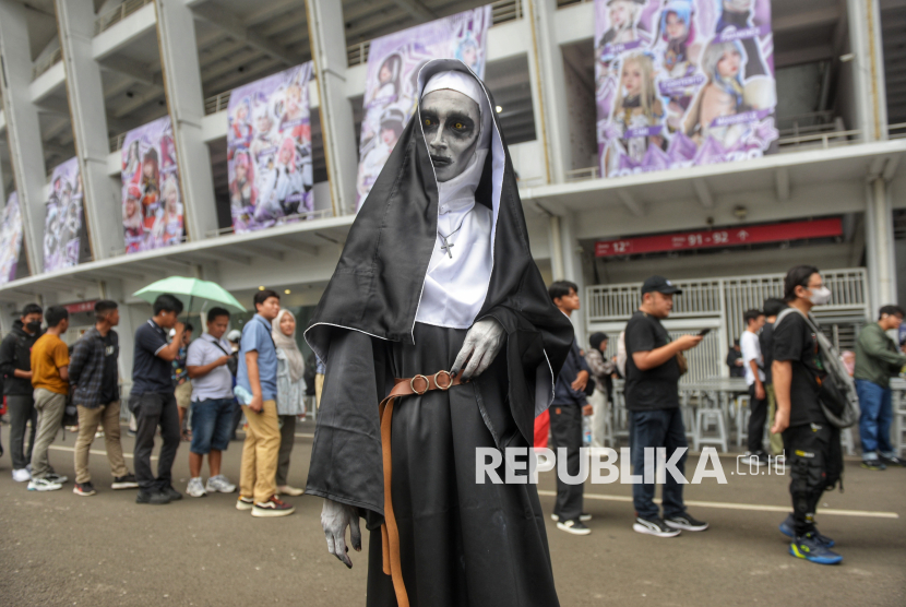 Pengunjung mengenakan kostum karakter hantu mengantri untuk masuk ke dalam ajang Cosplay Expo 2025 di Gelora Bung Karno (GBK), Senayan, Jakarta, Sabtu (18/10/2025). Cosplay Expo 2025 menjadi salah satu ajang budaya pop paling dinantikan tahun ini. Acara yang berlangsung selama dua hari tersebut menampilkan beragam pertunjukan, mulai dari penampilan cosplayer ternama hingga aksi panggung idol performance. Kegiatan ini tidak hanya menjadi hiburan, tetapi juga menjadi wadah apresiasi terhadap kreativitas dan semangat komunitas budaya pop yang terus berkembang. (FOTO : Republika/Prayogi)