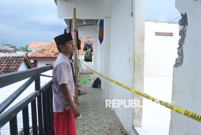Seorang warga menunjukkan atap kamar yang telah ambruk di Pondok Pesantren Salafiyah Syafi (FOTO : ANTARA FOTO/Seno)