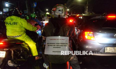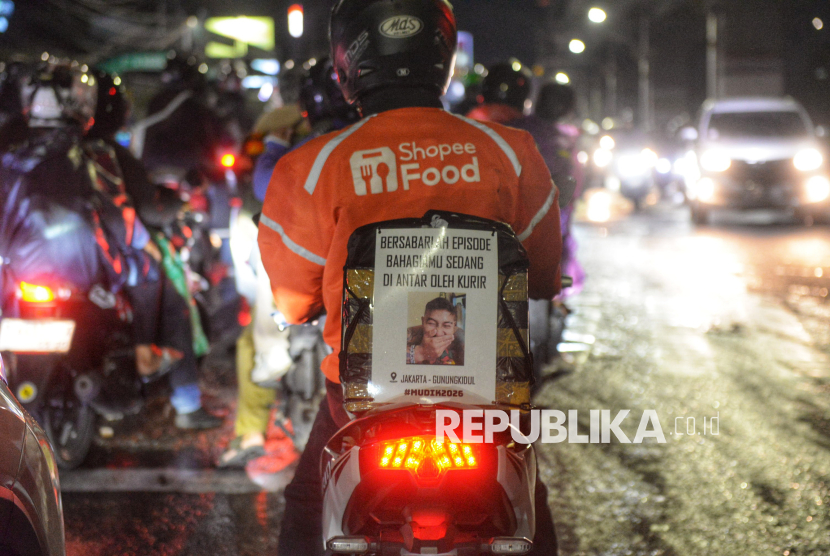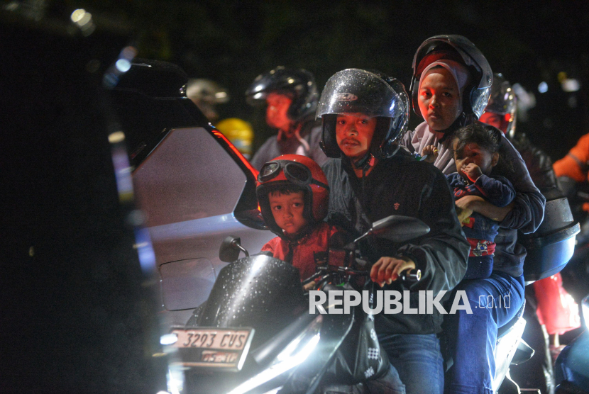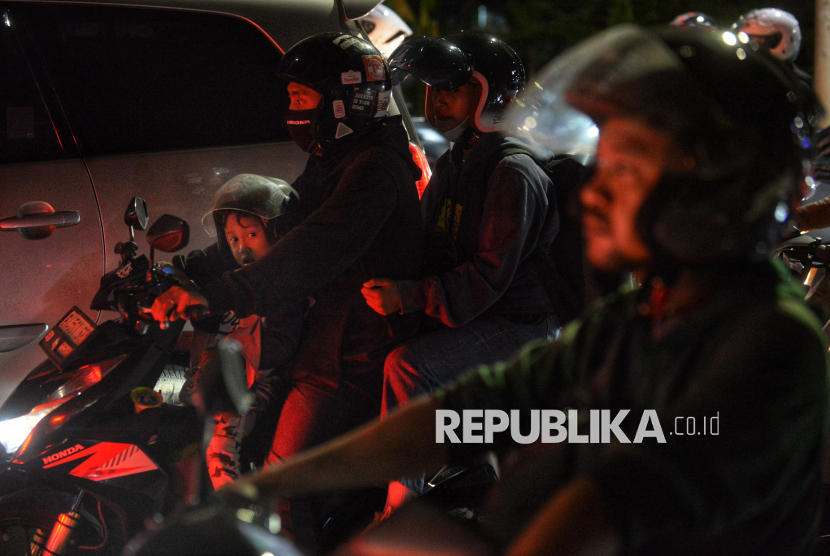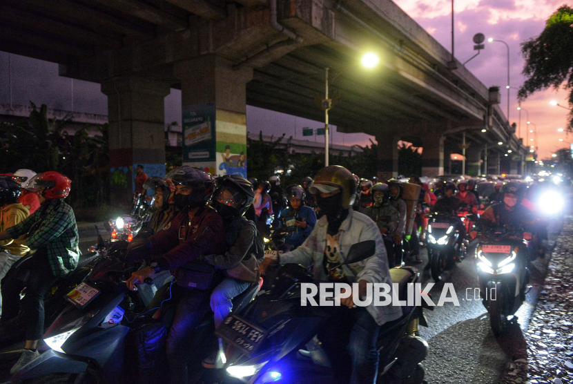 Sejumlah pemudik bersepeda motor melintas di kawasan Kalimalang, Jakarta, Rabu (18/3/2026). Arus mudik Lebaran 1447 H mulai menunjukkan peningkatan signifikan di jalur tersebut pada H-3 Idulfitri. Ratusan pemudik roda dua terpantau ramai menuju jalur Pantura dengan tujuan berbagai wilayah di Jawa Barat, Jawa Tengah, hingga Jawa Timur. Pemudik memilih berangkat pada malam hari untuk menghindari terik matahari. Selain membawa beragam barang bawaan yang diikat di bagian belakang kendaraan, sebagian pemudik juga menempelkan tulisan-tulisan lucu, sindiran, hingga curahan hati pada motor atau barang bawaannya. Meski volume kendaraan menuju arah Bekasi dan jalur Pantura meningkat, arus lalu lintas terpantau ramai lancar dan hanya sesekali melambat di sejumlah titik persimpangan. (FOTO : Republika/Prayogi)