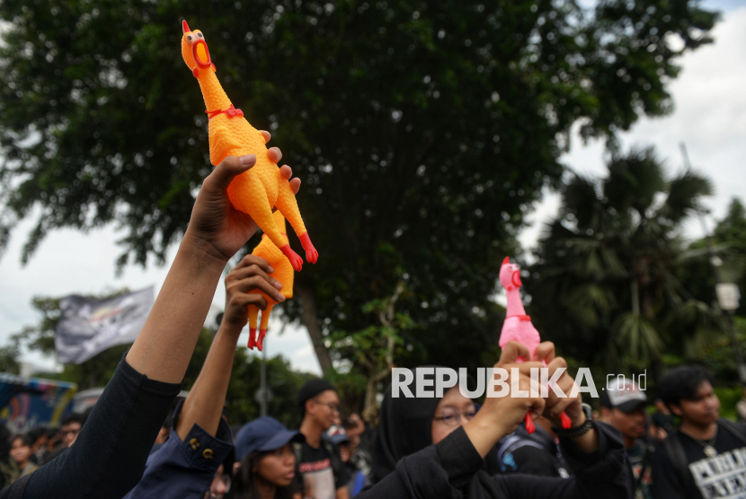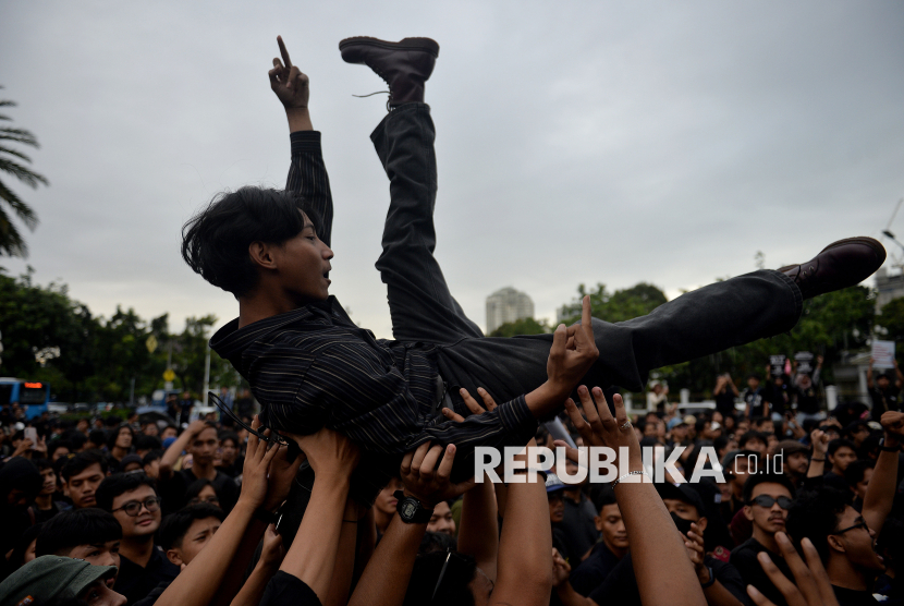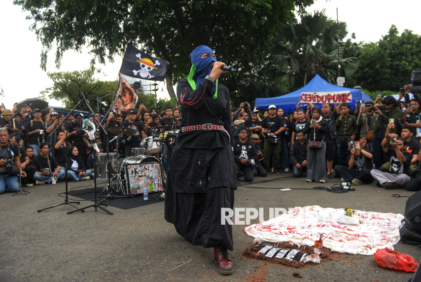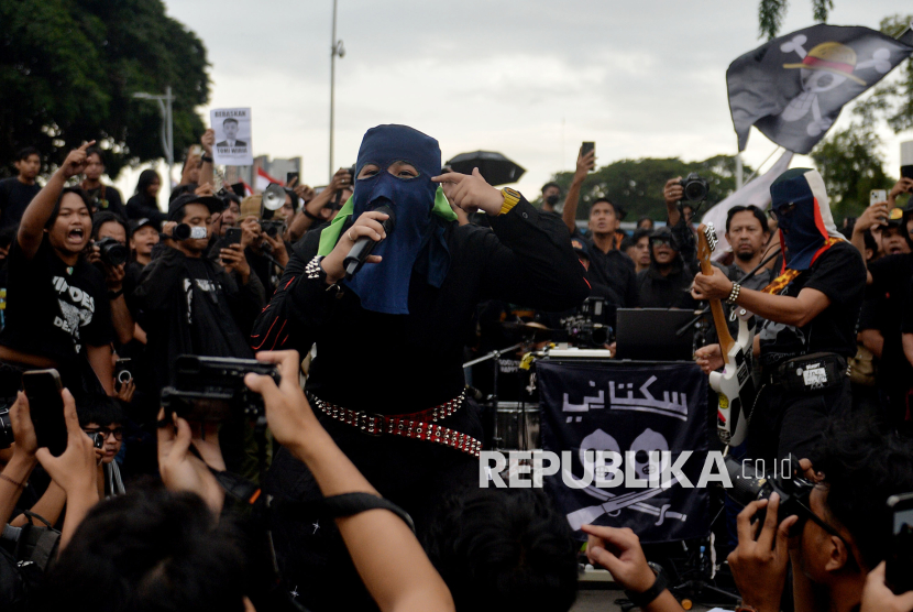 Grup Musik Sukatani tampil saat aksi Kamisan ke-893 di depan Istana Merdeka, Jakarta, Kamis (15/1/2026). Aksi Kamisan ke-19 tahun itu mengusung tema Bergerak, Bersolidaritas, Merebut Kedaulatan Rakyat!. (FOTO : Republika/Prayogi)