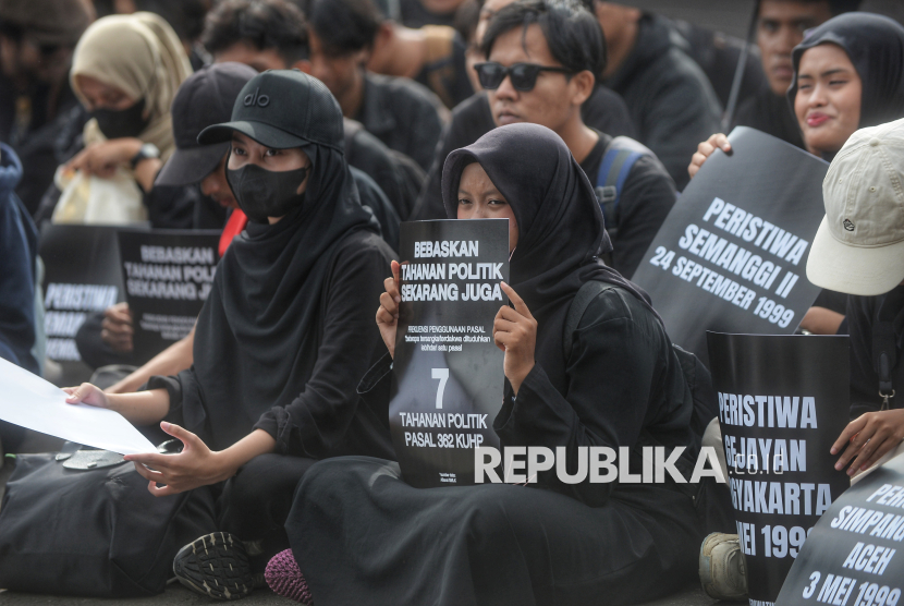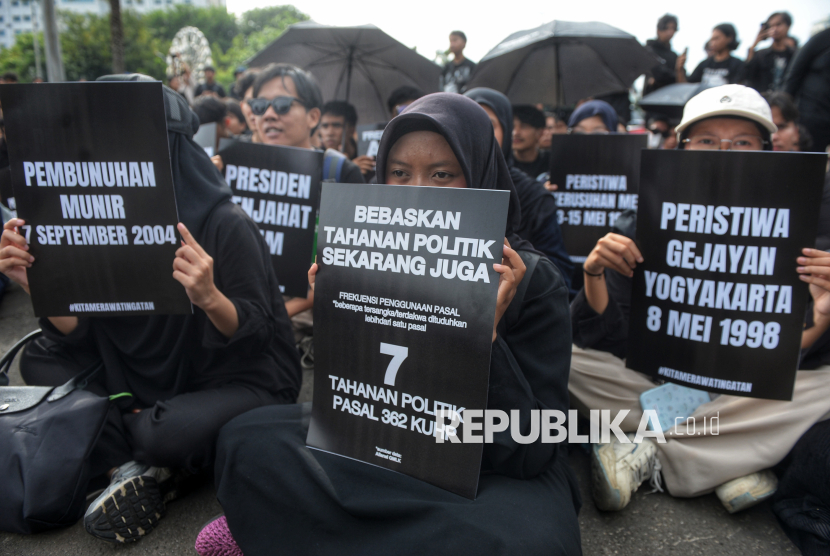 Sejumlah orang menghadiri aksi Kamisan ke-893 di depan Istana Merdeka, Jakarta, Kamis (15/1/2026). Aksi Kamisan ke-19 tahun itu mengusung tema Bergerak, Bersolidaritas, Merebut Kedaulatan Rakyat!. (FOTO : Republika/Prayogi)