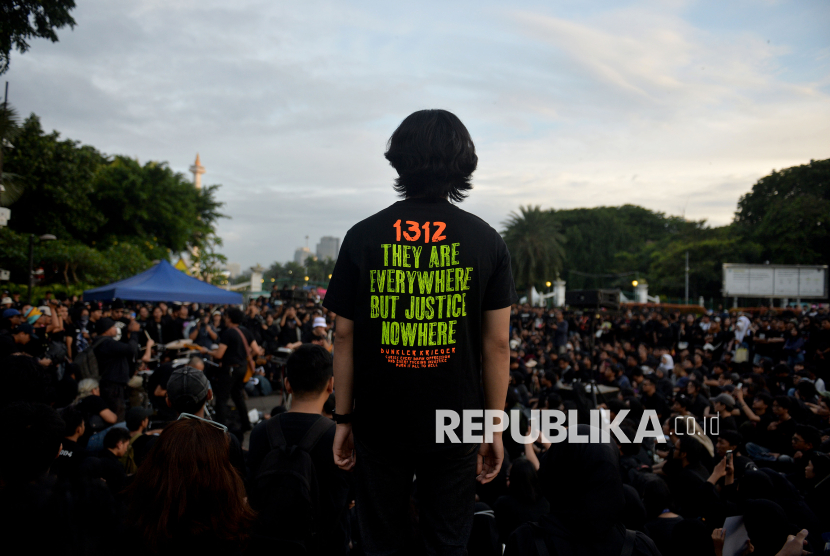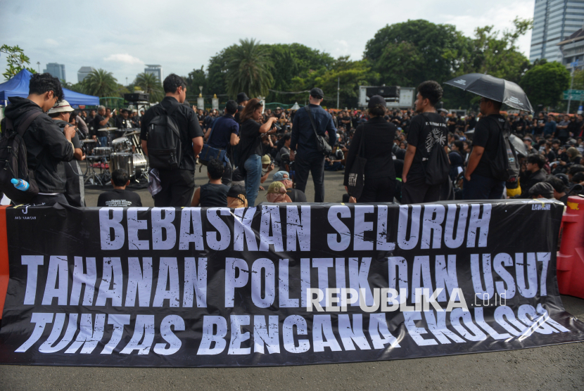 Band Sukatani tampil di Aksi Kamisan ke-893 di depan Istana Negara, Jakarta Pusat, Kamis (15/1/2026). Dalam rangka memperingati 19 tahun Aksi Kamisan, masyarakat sipil menegaskan penolakan terhadap normalisasi kekerasan negara, sekaligus menguatkan tuntutan penyelesaian pelanggaran hak asasi manusia (HAM) dan penghentian impunitas. (FOTO : Edwin Putranto/Republika)