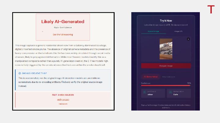Technical analysis using the AI detection tool, Image Whisperer, flagged a screenshot of the video as AI content. The software identified synthetic patterns within the rendering of the explosion's dust clouds.