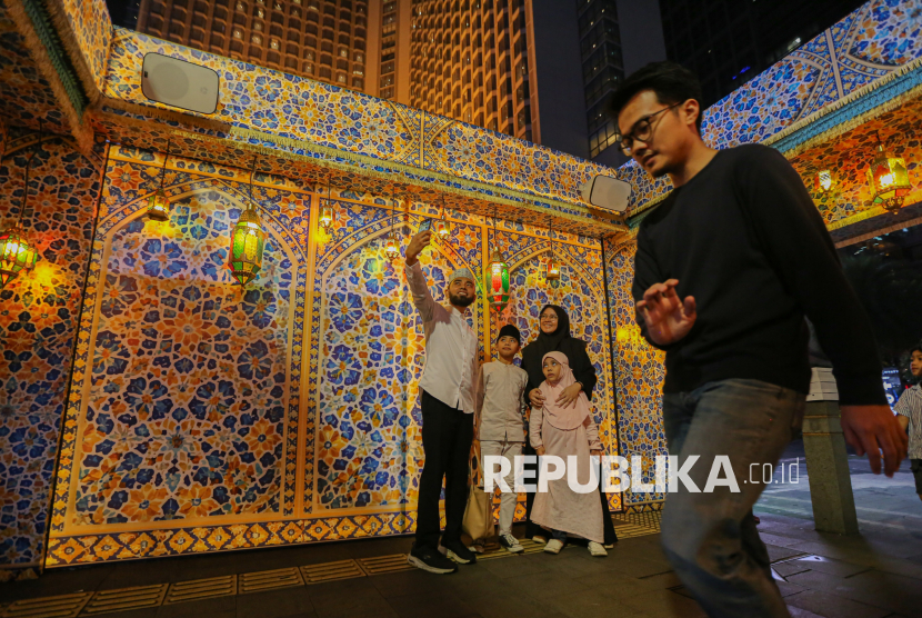 Warga menikmati suasana di sekitar aneka lampu hias pada Jakarta Light Festival 2026 di kawasan Bundaran HI, Jakarta, Jumat (28/2/2026). Dekorasi aneka lampu hias bernuansa islami tersebut menghiasi area pedestrian di kawasan Bundaran Hotel Indonesia untuk menyemarakan bulan suci Ramadhan 1447 Hijriah dan akan berlangsung selama sekitar 4 pekan hingga 24 Maret 2026. (FOTO : Republika/Thoudy Badai)