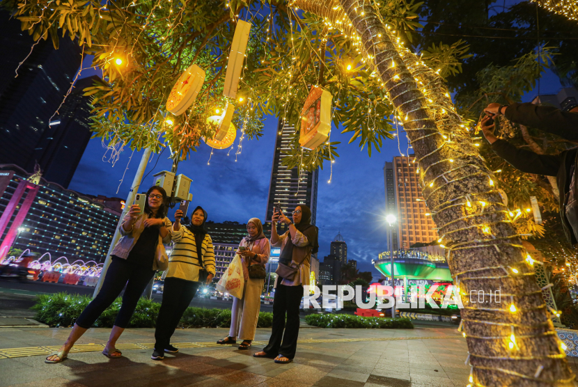 REPUBLIKA.CO.ID, JAKARTA -- Warga menikmati suasana di sekitar aneka lampu hias pada Jakarta Light Festival 2026 di kawasan Bundaran HI, Jakarta, Jumat (28/2/2026).