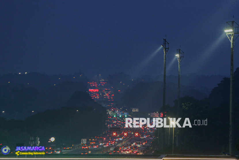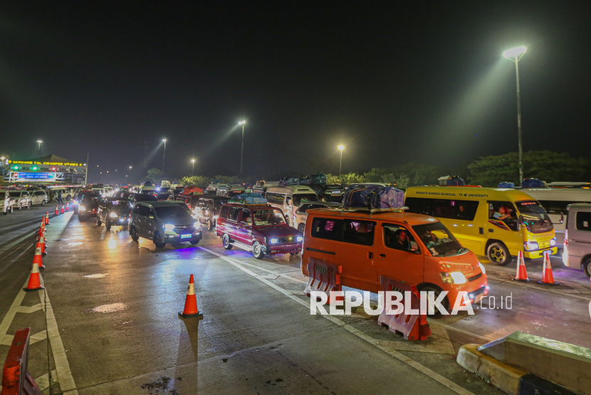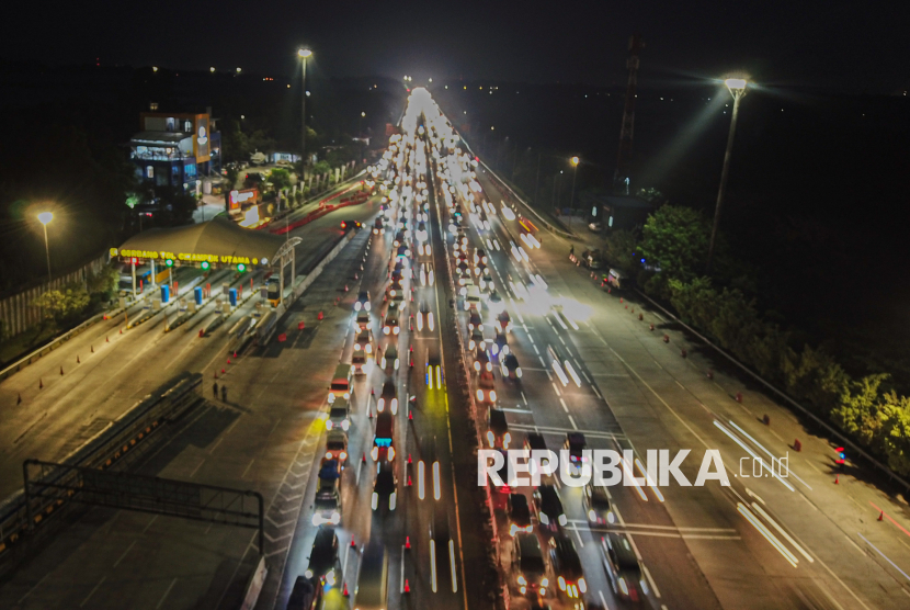 Suasana kepadatan kendaraan pemudik di Gerbang Tol Cikampek Utama, Karawang, Jawa Barat, Rabu (18/3/2026). Berdasarkan data sementara Pos Pantau Cikampek, volume kendaraan pada Selasa (17/3) hingga Rabu (18/3) dini hari mencapai 96.118 kendaraan atau mengalami lonjakan jumlah kendaraan menjelang hari raya idul fitri (FOTO : Republika/Thoudy Badai)