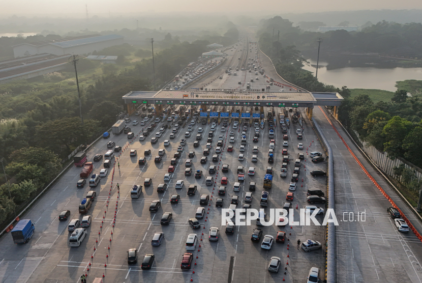 Foto aerial suasana kepadatan kendaraan pemudik di Gerbang Tol Cikampek Utama, Karawang, Jawa Barat, Rabu (18/3/2026). Berdasarkan data sementara Pos Pantau Cikampek, volume kendaraan pada Selasa (17/3) hingga Rabu (18/3) dini hari mencapai 96.118 kendaraan atau mengalami lonjakan jumlah kendaraan menjelang hari raya idul fitri (FOTO : Republika/Thoudy Badai)