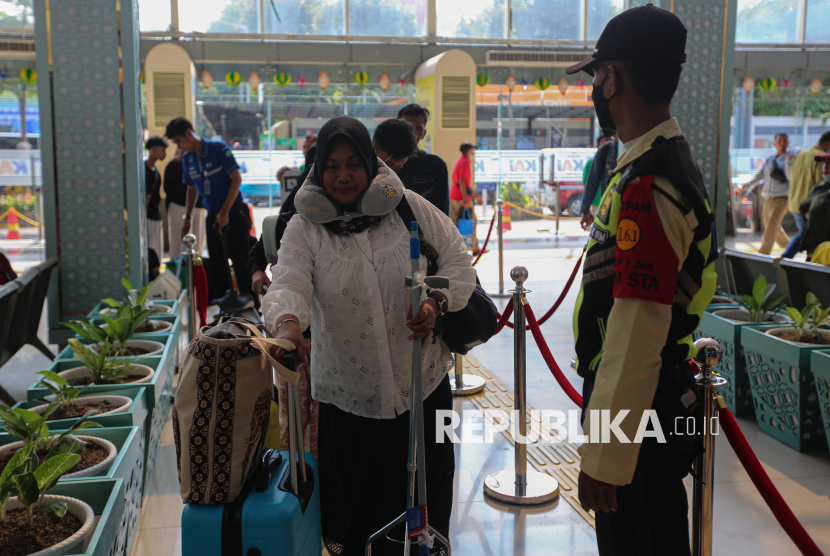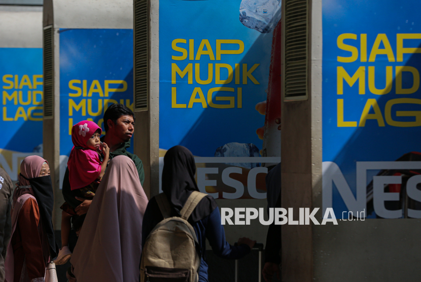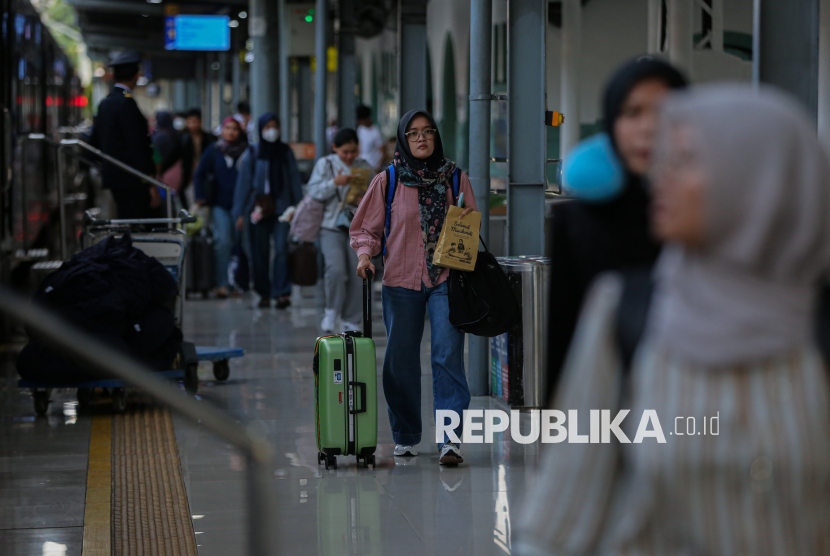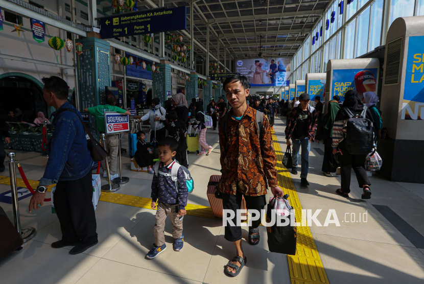Pemudik bergegas menuju area peron untuk menaiki kereta di Stasiun Pasar Senen, Jakarta, Sabtu (14/3/2026). Berdasarkan data KAI Daop 1 Jakarta, jumlah pemudik pada H-6 lebaran yang berangkat dari Stasiun Pasar Senen mencapai 50.179 penumpang dan diprediksi puncak arus mudik terjadi pada tanggal 17-18 Maret mendatang. (FOTO : Republika/Thoudy Badai)