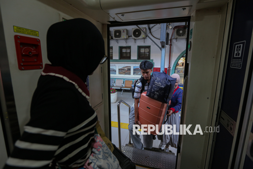 Pemudik menaiki kereta di Stasiun Pasar Senen, Jakarta, Sabtu (14/3/2026). Berdasarkan data KAI Daop 1 Jakarta, jumlah pemudik pada H-6 lebaran yang berangkat dari Stasiun Pasar Senen mencapai 50.179 penumpang dan diprediksi puncak arus mudik terjadi pada tanggal 17-18 Maret mendatang. (FOTO : Republika/Thoudy Badai)