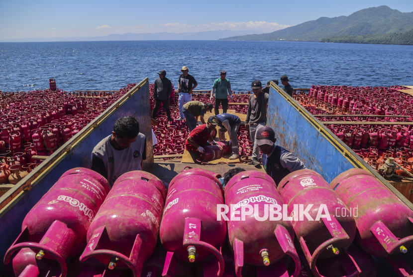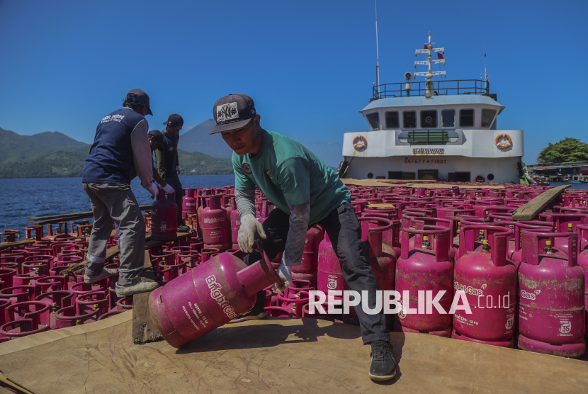 REPUBLIKA.CO.ID, TERNATE -- Pekerja melakukan bongkar muat tabung gas Elpiji nonsubsidi ukuran 12 kg yang didatangkan dari Ambon di Pelabuhan Ahmad Yani Ternate, Maluku Utara, Sabtu (25/4/2026).