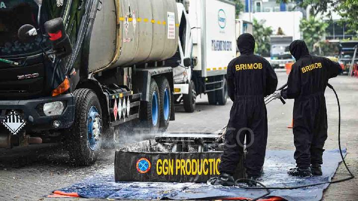 Gegana Brimob Polri personnel decontaminating vehicles contaminated with Cesium-137 in the Modern Industrial Area Cikande, Serang Regency, Banten, October 7, 2025. Tempo/Tony Hartawan