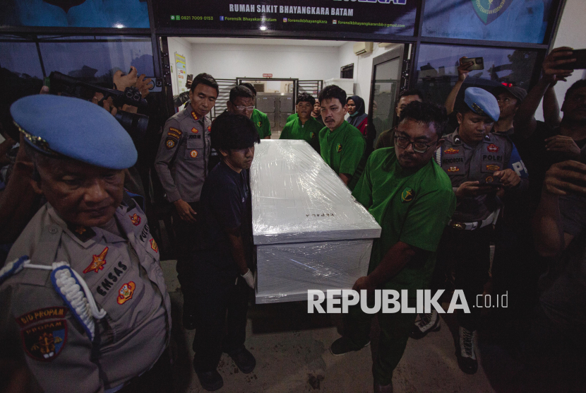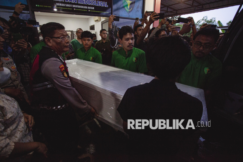 Sejumlah petugas mengangkat peti jenazah Bripda Natanael Simanungkalit menuju mobil ambulans untuk dipulangkan, di depan Ruang Instalasi Forensik Rumah Sakit Bhayangkara, Batam, Kepulauan Riau, Selasa (14/4/2026). Bidpropam Polda Kepulauan Riau telah mengamankan delapan anggota Direktorat Samapta untuk diperiksa terkait dugaan penganiayaan yang menyebabkan kematian Bripda Natanael Simanungkalit. (FOTO : ANTARA FOTO/Teguh Prihatna)