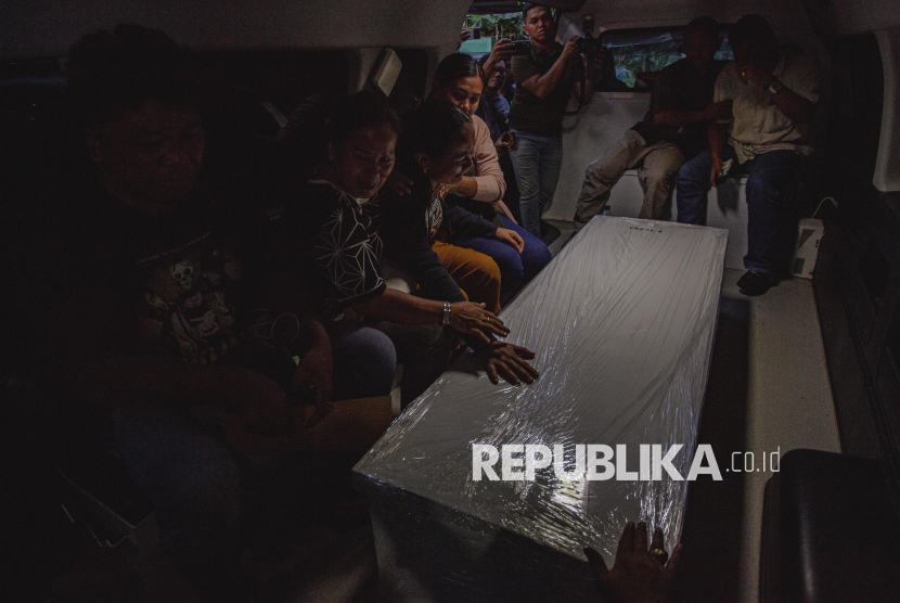 REPUBLIKA.CO.ID, BATAM -- Kerabat menangis di dekat peti jenazah Bripda Natanael Simanungkalit, di dalam mobil ambulans saat akan diberangkatkan dari Rumah Sakit Bhayangkara, Batam, Kepulauan Riau, Selasa (14/4/2026).