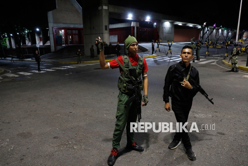 Tentara berjaga di area sekitar istana kepresidenan Miraflores setelah terdengar ledakan di Caracas, Venezuela, Sabtu (3/1/2026). Sejumlah ledakan besar terdengar di ibu kota Venezuela, Caracas, pada Sabtu waktu setempat. (FOTO : AP Photo/Cristian Hernandez)