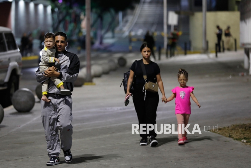 Warga mengungsi dari sebuah gedung yang berlokasi di dekat istana kepresidenan Miraflores setelah terdengar ledakan di Caracas, Venezuela, Sabtu (3/1/2026). Asap terlihat mengepul dari hanggar pangkalan militer di Caracas. Instalasi militer lainnya di ibu kota tidak mendapat aliran listrik. Warga di sejumlah wilayah Caracas tampak bergegas untuk mengungsi ketempat aman. (FOTO : AP Photo/Cristian Hernandez)