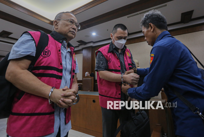 Terdakwa Direktur Utama PT Pertamina Patra Niaga (PPN) periode 2021-2023 Alfian Nasution (kiri) bersama Business Development Manager Trafigura Pte Ltd periode 2019-2021 Martin Haendra Nata mengenakan rompi tahanan usai mengikuti sidang tuntutan di Pengadilan Tipikor Jakarta, Kamis (23/4/2026). Jaksa penuntut umum (JPU) menuntut tiga terdakwa diantaranya Alfian Nasution dengan hukuman 14 tahun penjara dan uang pengganti Rp 5 miliar subsider 7 tahun penjara, sementara Direktur Pemasaran dan Niaga Pertamina periode 2012-2014 Hanung Budya Yuktyanta dituntut 8 tahun penjara serta uang pengganti Rp 4 miliar subsider 4 tahun penjara dan Martin Haendra Nata dituntut 13 tahun penjara Rp 5 miliar subsider 7 tahun penjara. Ketiga terdakwa tersebut juga dituntut membayar pidana sebesar Rp 1 miliar, karena jaksa menilai Alfian bersama dua terdakwa lainnya terbukti bersalah melakukan tindak pidana korupsi tata kelola minyak mentah dan produk kilang pada tahun 2018-2023. (FOTO : Republika/Thoudy Badai)
