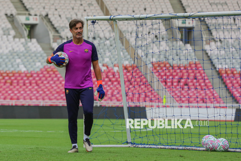Penjaga gawang legenda Barcelona Jesus Angoy saat sesi latihan jelang laga Clash of Legends Jakarta 2026 di Stadion Utama Gelora Bung Karno (SUGBK) Jakarta, Jumat (17/4/2026). Pertandingan para legenda sepak bola bertajuk Clash of Legends Jakarta 2026 tersebut akan mempertemukan Barcelona Legends melawan DRX World Legends yang berlangsung di Stadion Utama Gelora Bung Karno pada 18 April 2026. (FOTO : Republika/Thoudy Badai)