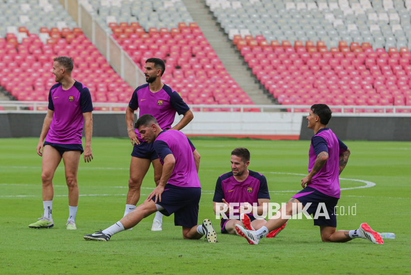 Sejumlah pemain Barcelona Legends melakukan sesi latihan jelang laga Clash of Legends Jakarta 2026 di Stadion Utama Gelora Bung Karno (SUGBK) Jakarta, Jumat (17/4/2026). Pertandingan para legenda sepak bola bertajuk Clash of Legends Jakarta 2026 tersebut akan mempertemukan Barcelona Legends melawan DRX World Legends yang berlangsung di Stadion Utama Gelora Bung Karno pada 18 April 2026. (FOTO : Republika/Thoudy Badai)