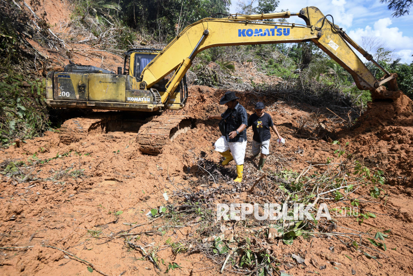 Warga berjalan di dekat alat berat yang mengeruk tanah untuk membuka akses jalan di Kelurahan Sipange, Kecamatan Tukka,Tapanuli Tengah, Sumatera Utara, Selasa (9/12/2025). Pemerintah Tapteng akan mendatangkan 20 unit alat berat guna membuka akses jalan untuk memudahkan proses pengiriman bantuan logistik ke sejumlah wilayah yang terisolir. (FOTO : ANTARA FOTO/Muhammad Adimaja)