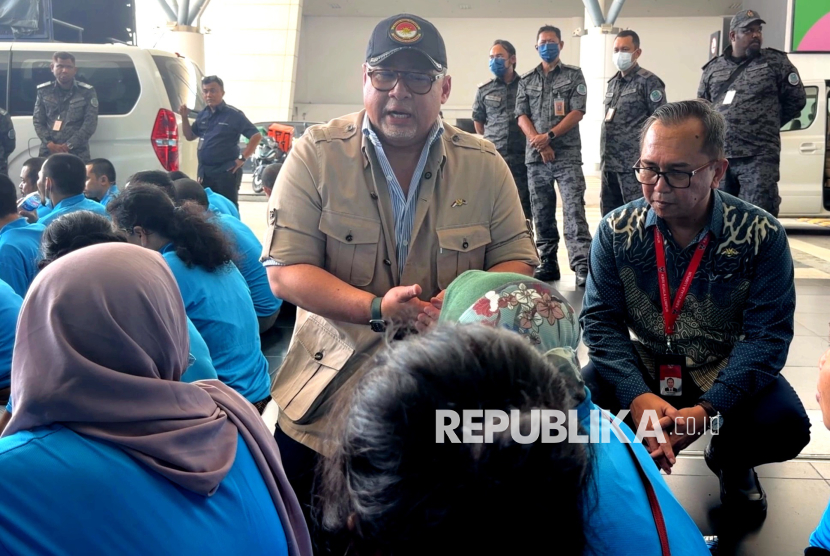 Duta Besar Republik Indonesia untuk Malaysia Raden Dato Mohammad Iman Hascarya Kusumo (kiri) berdialog dengan sejumlah pekerja migran Indonesia (PMI) yang akan dipulangkan ke Indonesia, di Bandara Internasional Kuala Lumpur, Sepang, Selangor, Malaysia, Kamis (23/4/2026). Kedutaan Besar Republiik Indonesia (KBRI) Kuala Lumpur memulangkan 217 PMI yang sebelumnya sempat menjalani penahanan di depot imigrasi Malaysia karena persoalan keimigrasian. (FOTO : ANTARA/Rangga Pandu Asmara Jingga)