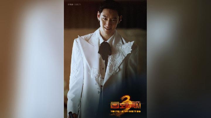 Di foto lainnya, Lee Je Hoon menampilkan sisi yang lebih dramatis dan berkelas. Ia mengenakan setelan jas putih dengan ornamen bordir di bagian bahu dan dada, yang dipadukan dengan kemeja putih dan dasi pita hitam. Senyum tipisnya yang penuh misteri memperlihatkan dualitas karakter Kim Do Gi, tegas dan dingin di satu sisi, namun cerdas dan penuh strategi di sisi lain.