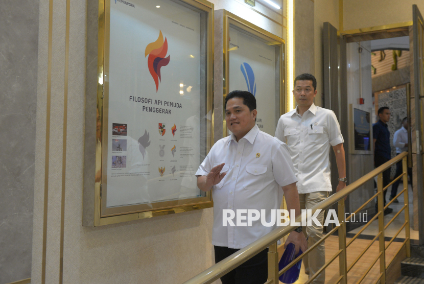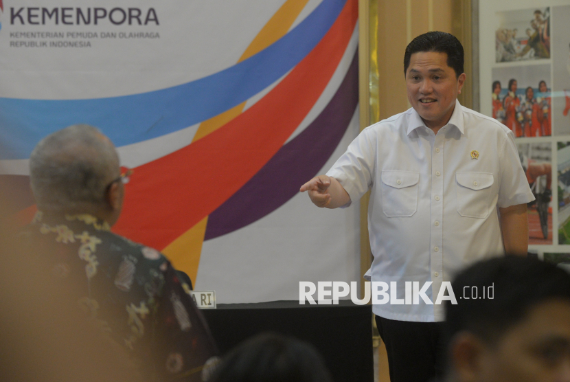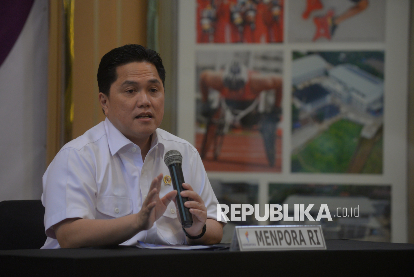 Menteri Pemuda dan Olahraga (Menpora) Erick Thohir usai memberikan keterangan pers terkait tanggapan pemerintah Indonesia terhadap pernyataan Komite Olimpiade Internasional (IOC) di kantor Kemenpora, Jakarta, Jumat (24/10/2025). Dalam kesempatan tersebut Erick Thohir mengatakan bahwa pernyataan Komite Olimpiade Internasional (IOC) kepada federasi internasional untuk tidak menggelar kegiatan olahraga di Indonesia bersifat rekomendatif atau imbauan. Selain itu, Erick menegaskan bahwa olahraga Indonesia tidak dibekukan oleh Komite Olimpiade Internasional (IOC), Indonesia tetap dapat mengirimkan atlet untuk berpartisipasi dalam ajang olahraga duni (FOTO : Republika/Prayogi)