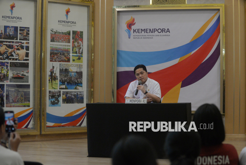 Menteri Pemuda dan Olahraga (Menpora) Erick Thohir memberikan keterangan pers terkait tanggapan pemerintah Indonesia terhadap pernyataan Komite Olimpiade Internasional (IOC) di kantor Kemenpora, Jakarta, Jumat (24/10/2025). Dalam kesempatan tersebut Erick Thohir mengatakan bahwa pernyataan Komite Olimpiade Internasional (IOC) kepada federasi internasional untuk tidak menggelar kegiatan olahraga di Indonesia bersifat rekomendatif atau imbauan. Selain itu, Erick menegaskan bahwa olahraga Indonesia tidak dibekukan oleh Komite Olimpiade Internasional (IOC), Indonesia tetap dapat mengirimkan atlet untuk berpartisipasi dalam ajang olahraga duni (FOTO : Republika/Prayogi)