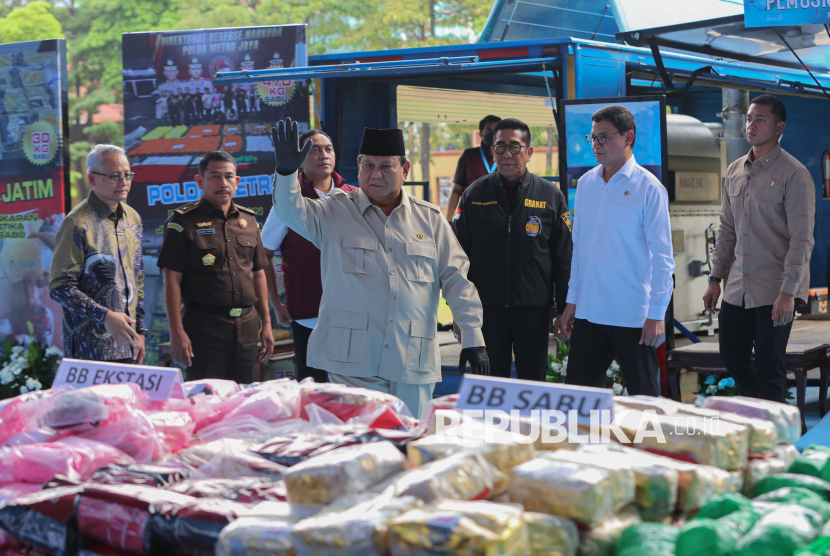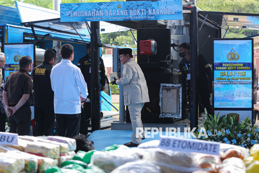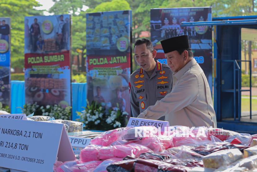 Presiden Prabowo Subianto menunjukan barang bukti narkoba sebelum dimusnahkan di Lapangan Bhayangkara, Mabes Polri, Jakarta Selatan, Rabu (29/10/2025). Barang bukti yang dimusnahkan merupakan hasil pengungkapan kasus narkotika selama periode Oktober 2024 hingga Oktober 2025, dengan total barang bukti narkoba sebanyak 214,8 ton. Dalam kegiatan tersebut, sebanyak 2,1 ton berbagai jenis narkoba dipajang untuk dimusnahkan. (FOTO : Republika/Thoudy Badai)