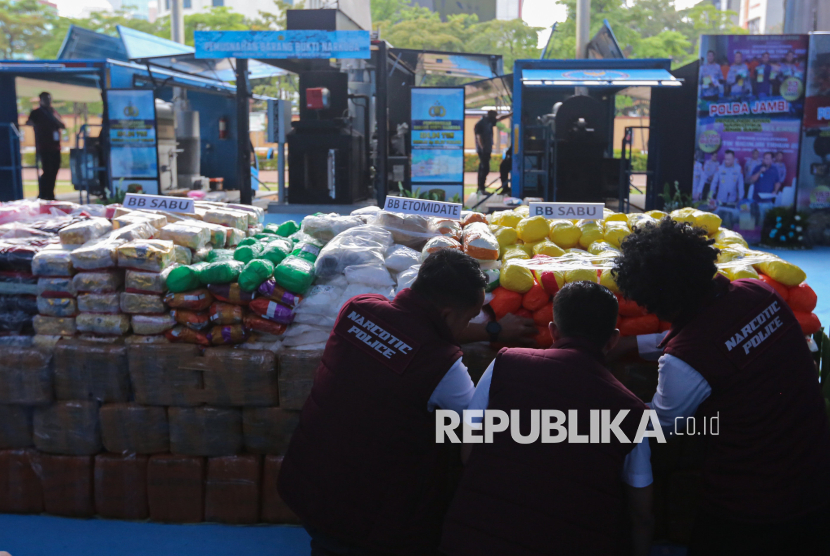 Barang bukti narkoba saat akan dimusnahkan di Lapangan Bhayangkara, Mabes Polri, Jakarta Selatan, Rabu (29/10/2025). (FOTO : Republika/Thoudy Badai)