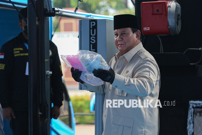 Presiden Prabowo Subianto menunjukan barang bukti narkoba saat pemusnahan barang bukti narkoba di Lapangan Bhayangkara, Mabes Polri, Jakarta Selatan, Rabu (29/10/2025). Kegiatan tersebut merupakan salah satu upaya untuk memberantas peredaran narkoba di Indonesia. (FOTO : Republika/Thoudy Badai)
