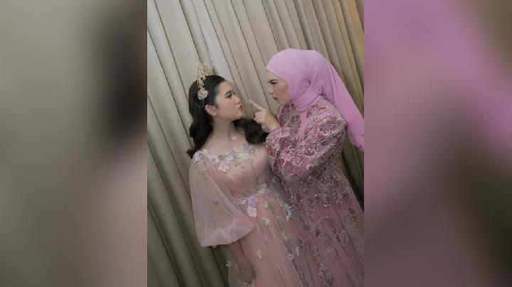 Dalam momen tersebut, Irish Bella mengenakan gaun panjang berwarna dusty pink dengan detail payet dan bordir mewah di permukaan busananya. Potongan gaun elegan itu juga hadir dengan tekstur transparan di bagian luar yang menambah kesan berkilau saat terkena cahaya. Irish pun memadukan busananya dengan hijab polos dengan warna senada, menciptakan tampilan anggun dan harmonis yang tetap modern.