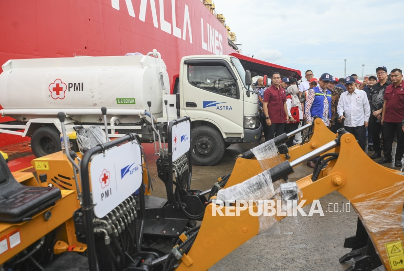 Ketua Umum PMI Jusuf Kalla (ketiga kanan) bersama Menteri Kesehatan Budi Gunadi Sadikin (keempat kanan) melihat jenis bantuan yang akan dikirimkan di Dermaga IKT Domestik, Pelabuhan Tanjung Priok, Jakarta, Jumat (2/1/2026). Palang Merah Indonesia (PMI) akan memberangkatkan 2.500 ton bantuan kemanusiaan ke wilayah terdampak bencana di Sumatera untuk mendukung tahap pemulihan dan rehabilitasi. (FOTO : ANTARA FOTO/Hafidz Mubarak A)