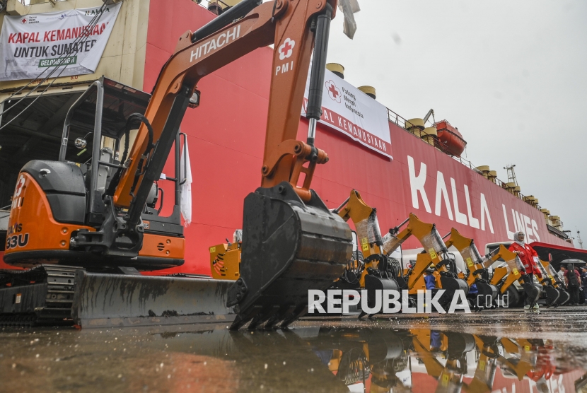 Bantuan ekskavator disiapkan untuk dimuat ke atas kapal di Dermaga IKT Domestik, Pelabuhan Tanjung Priok, Jakarta, Jumat (2/1/2026). Palang Merah Indonesia (PMI) akan memberangkatkan 2.500 ton bantuan kemanusiaan ke wilayah terdampak bencana di Sumatera untuk mendukung tahap pemulihan dan rehabilitasi. (FOTO : ANTARA FOTO/Hafidz Mubarak A)