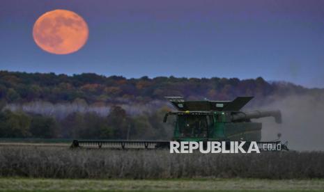 Mesin pertanian memanen kacang kedelai dengan latar supermoon di Boonville, Rabu (5/11/2025). Fenomen supermoon kali ini merupakan yang terbesar yang dapat terlihat pada tahun ini. Supermoon terjadi saat bulan berada dalam jarak terdekatnya dengan bumi. (FOTO : AP Photo/Charlie Riedel)