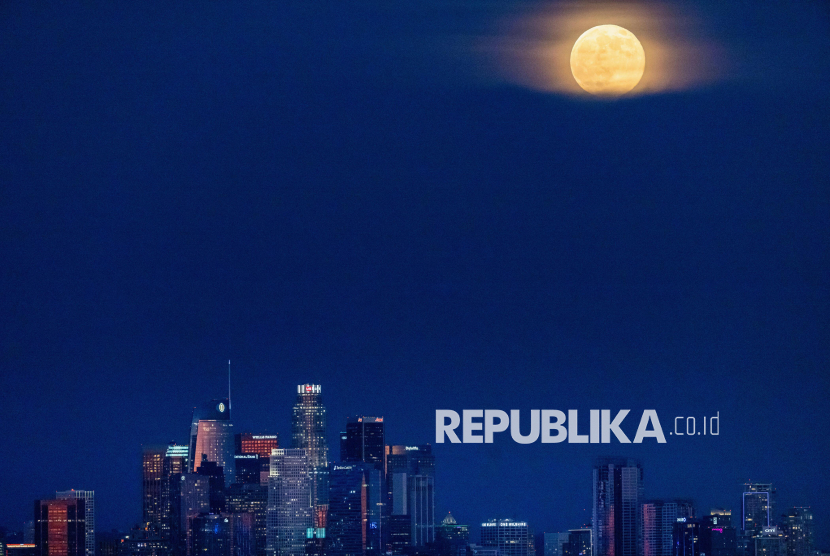 Fenomena supermoon terlihat di atas pusat kota Los Angeles, Rabu (5/11/2025). Fenomen supermoon kali ini merupakan yang terbesar yang dapat terlihat pada tahun ini. Supermoon terjadi saat bulan berada dalam jarak terdekatnya dengan bumi. (FOTO : AP Photo/Ethan Swope)