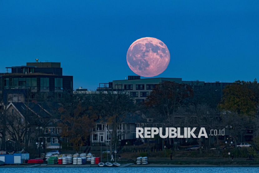 Fenomena supermoon terlihat di Minneapolis, Rabu (5/11/2025). Fenomen supermoon kali ini merupakan yang terbesar yang dapat terlihat pada tahun ini. Supermoon terjadi saat bulan berada dalam jarak terdekatnya dengan bumi. (FOTO : Kerem Yucel/Minnesota Public Radio via AP)