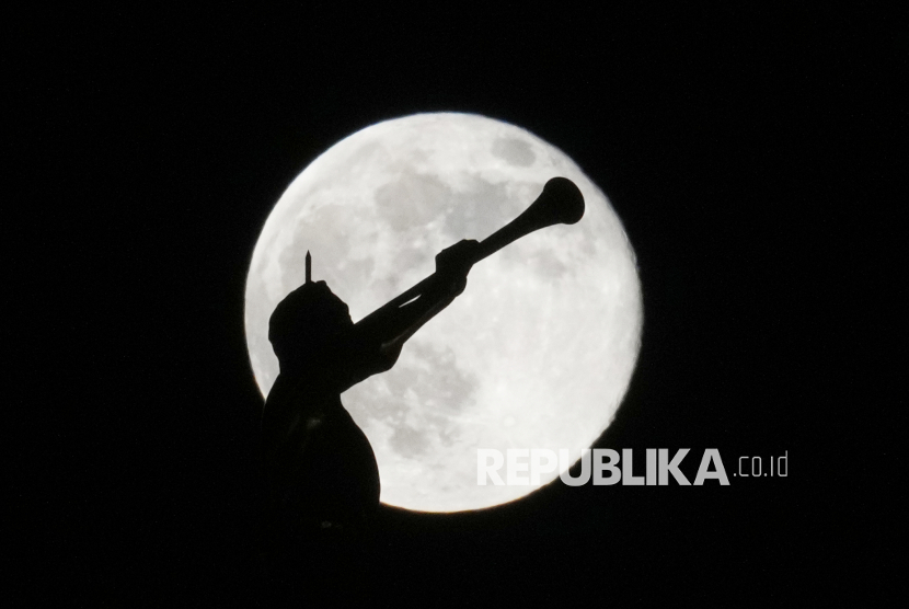 Patung Malaikat Moroni di atas Bait Suci Dallas, Texas terlihat dengan latar supermoon di Dallas, Rabu (5/11/2025). Fenomen supermoon kali ini merupakan yang terbesar yang dapat terlihat pada tahun ini. Supermoon terjadi saat bulan berada dalam jarak terdekatnya dengan bumi. (FOTO : AP Photo/Julio Cortez)