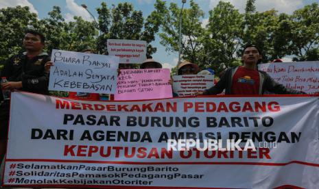 REPUBLIKA.CO.ID, JAKARTA -- Sejumlah pedagang burung Pasar Barito menggelar aksi di depan Gedung Balai Kota DKI Jakarta, Jakarta, Selasa (14/10/2025).