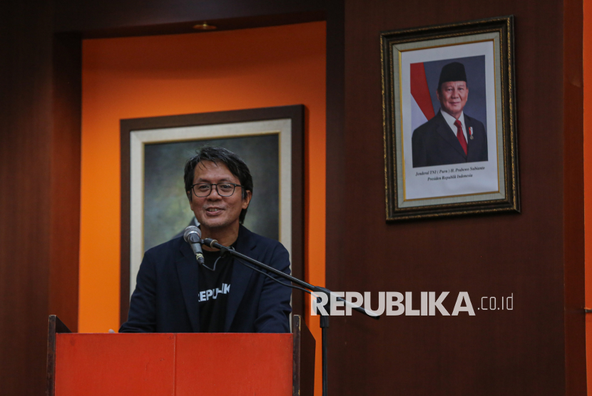 Pemimpin Redaksi Republika Andi Muhyiddin menyampaikan sambutan dalam acara Out Loud, Talkshow and Healing Experiences di Aula FISIP UI, Depok, Jawa Barat, Kamis (26/2/2026). Republika bersama Badan Konseling Mahasiswa (BKM) FISIP UI menggelar talkhsow terkait mental health dengan tema Grow Through What You Go Through yang diharapkan menjadi sarana edukasi sekaligus ruang aman bagi penyintas untuk berbagi kisah dan pengalaman dalam menghadapi kondisi kesehatan mental. (FOTO : Republika/Thoudy Badai)