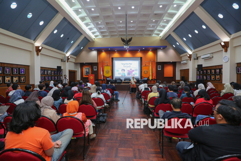 Peserta mengikuti sesi talkshow dalam acara Out Loud, Talkshow and Healing Experiences di Aula FISIP UI, Depok, Jawa Barat, Kamis (26/2/2026). Republika bersama Badan Konseling Mahasiswa (BKM) FISIP UI menggelar talkhsow terkait mental health dengan tema Grow Through What You Go Through yang diharapkan menjadi sarana edukasi sekaligus ruang aman bagi penyintas untuk berbagi kisah dan pengalaman dalam menghadapi kondisi kesehatan mental. (FOTO : Republika/Thoudy Badai)