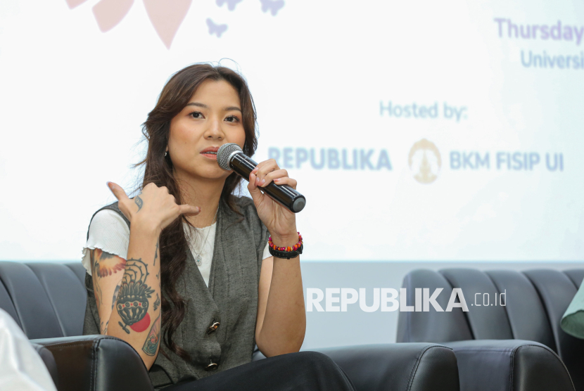 Counselor BKM FISIP UI Annisah saat sesi talkshow dalam acara Out Loud, Talkshow and Healing Experiences di Aula FISIP UI, Depok, Jawa Barat, Kamis (26/2/2026). Republika bersama Badan Konseling Mahasiswa (BKM) FISIP UI menggelar talkhsow terkait mental health dengan tema Grow Through What You Go Through yang diharapkan menjadi sarana edukasi sekaligus ruang aman bagi penyintas untuk berbagi kisah dan pengalaman dalam menghadapi kondisi kesehatan mental. (FOTO : Republika/Thoudy Badai)
