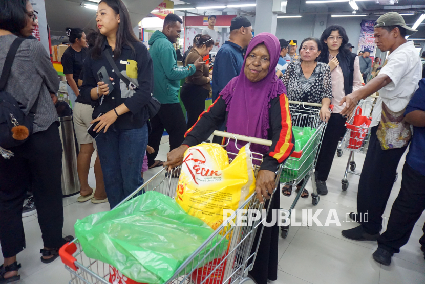 Warga mendorong troli belanja seusai menerima bantuan belanja dari Wakil Presiden Gibran Rakabuming Raka di Kota Sorong, Papua Barat Daya, Selasa (21/4/2026). Dalam kunjungan perdananya di Provinsi Papua Barat Daya, Wakil Presiden Gibran Rakabuming Raka memberikan bantuan belanja sembako untuk 100 Mama Papua sebesar Rp500 ribu. (FOTO : ANTARA FOTO/Olha Mulalinda)