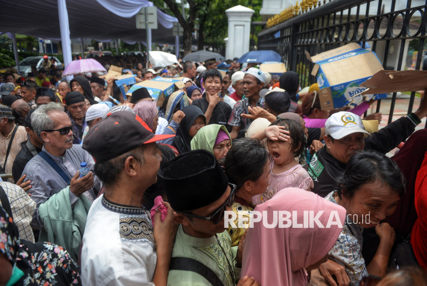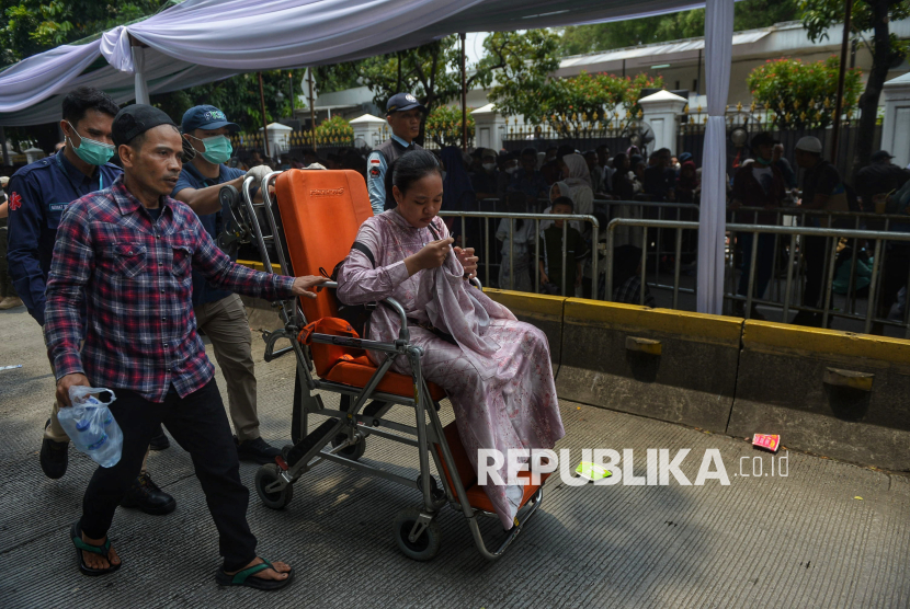 Warga pingsan saat mengantre untuk menghadiri Gelar Griya di Istana Kepresidenan, Jakarta, Sabtu (21/3/2026). Presiden Prabowo Subianto menggelar Gelar Griya Idulfitri 1447 Hijriah di Istana Kepresidenan bagi masyarakat umum. Sekitar 5.000 orang menghadiri gelar griya tersebut yang berlangsung sejak siang hingga sore hari. (FOTO : Republika/Prayogi)