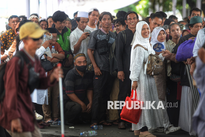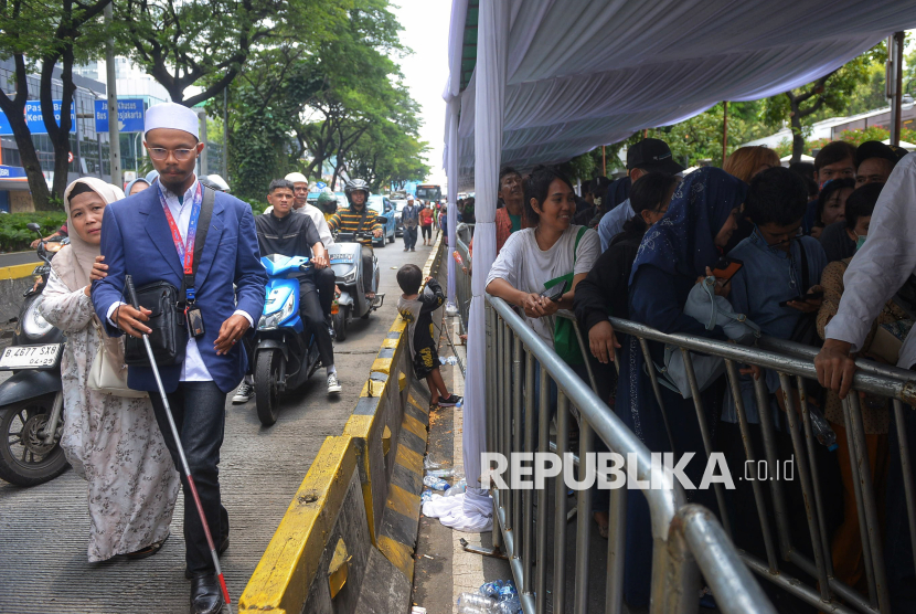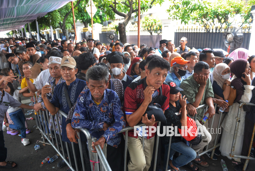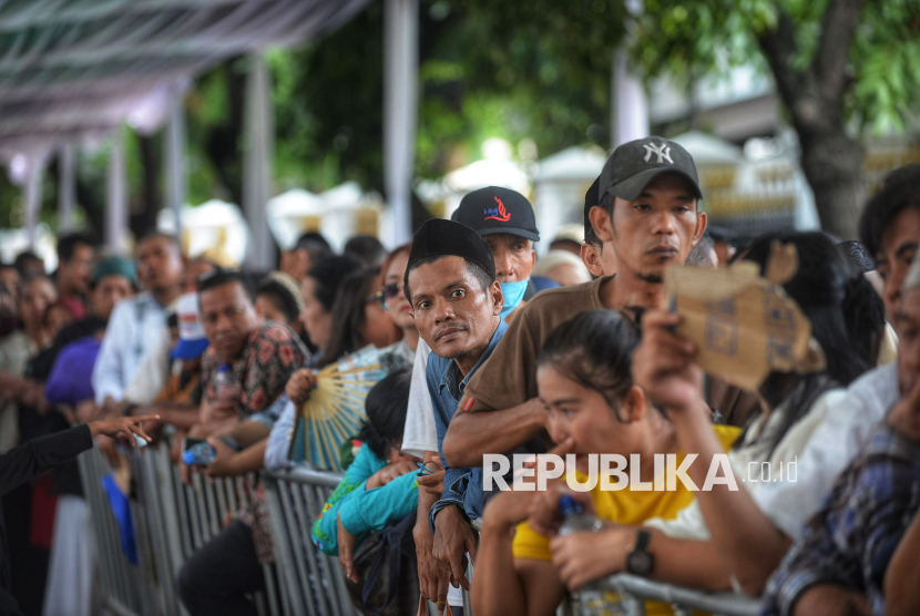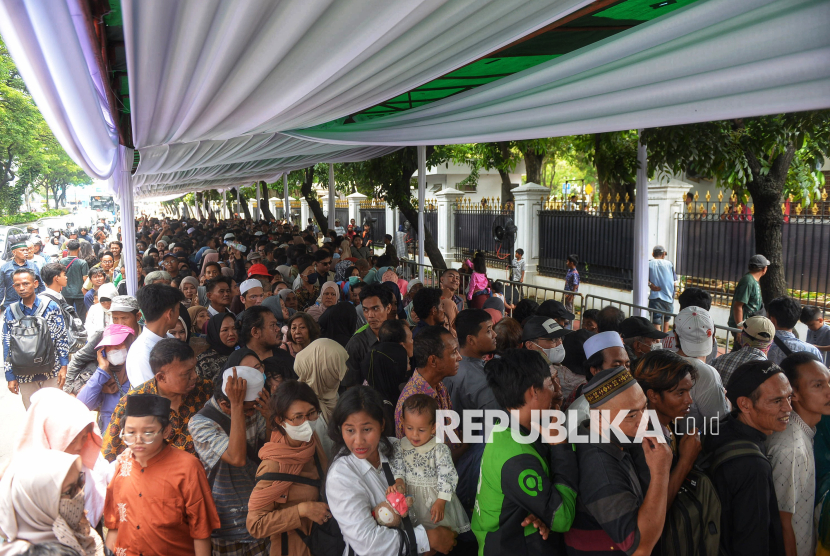 Warga mengantre untuk menghadiri Gelar Griya atau open house di Istana Kepresidenan, Jakarta, Sabtu (21/3/2026). Presiden Prabowo Subianto menggelar Gelar Griya atau open house Idulfitri 1447 Hijriah di Istana Kepresidenan bagi masyarakat umum. Sekitar 5.000 orang dapat menghadiri gelar griya atau open house tersebut yang berlangsung sejak siang hingga sore hari. (FOTO : Republika/Prayogi)