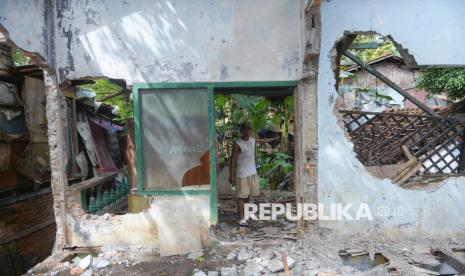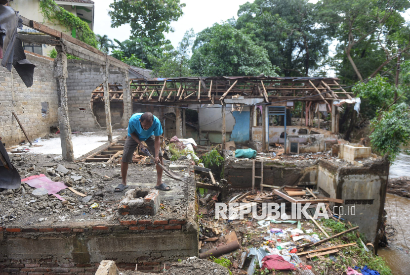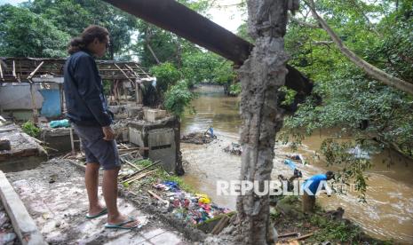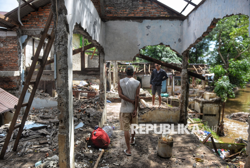 Warga melihat kondisi rumah yang dibongkar akibat terkena pembebasan lahan untuk normalisasi Kali Ciliwung di kawasan Taman Harapan, Cawang, Jakarta, Rabu (4/2/2026). Pembebasan lahan untuk normalisasi kali Ciliwung ini merupakan bagian dari upaya serius Pemerintah Provinsi DKI Jakarta dalam mengatasi banjir. Program normalisasi Kali Ciliwung yang sempat terhenti sejak 2017 tersebut kembali dilanjutkan sebagai langkah pengendalian banjir jangka menengah di Ibu Kota dan ditargetkan mampu mengurangi potensi banjir hingga 40 persen. (FOTO : Republika/Prayogi)