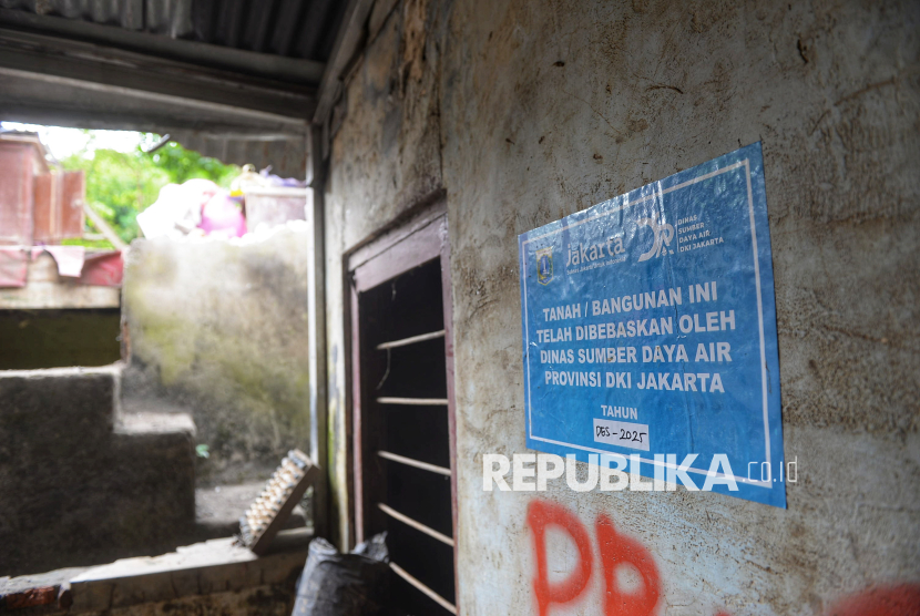 Stiker tanda pembebasan lahan untuk normalisasi tertempel di salah satu rumah warga di kawasan Taman Harapan, Cawang, Jakarta, Rabu (4/2/2026). Pembebasan lahan untuk normalisasi kali Ciliwung ini merupakan bagian dari upaya serius Pemerintah Provinsi DKI Jakarta dalam mengatasi banjir. Program normalisasi Kali Ciliwung yang sempat terhenti sejak 2017 tersebut kembali dilanjutkan sebagai langkah pengendalian banjir jangka menengah di Ibu Kota dan ditargetkan mampu mengurangi potensi banjir hingga 40 persen. (FOTO : Republika/Prayogi)
